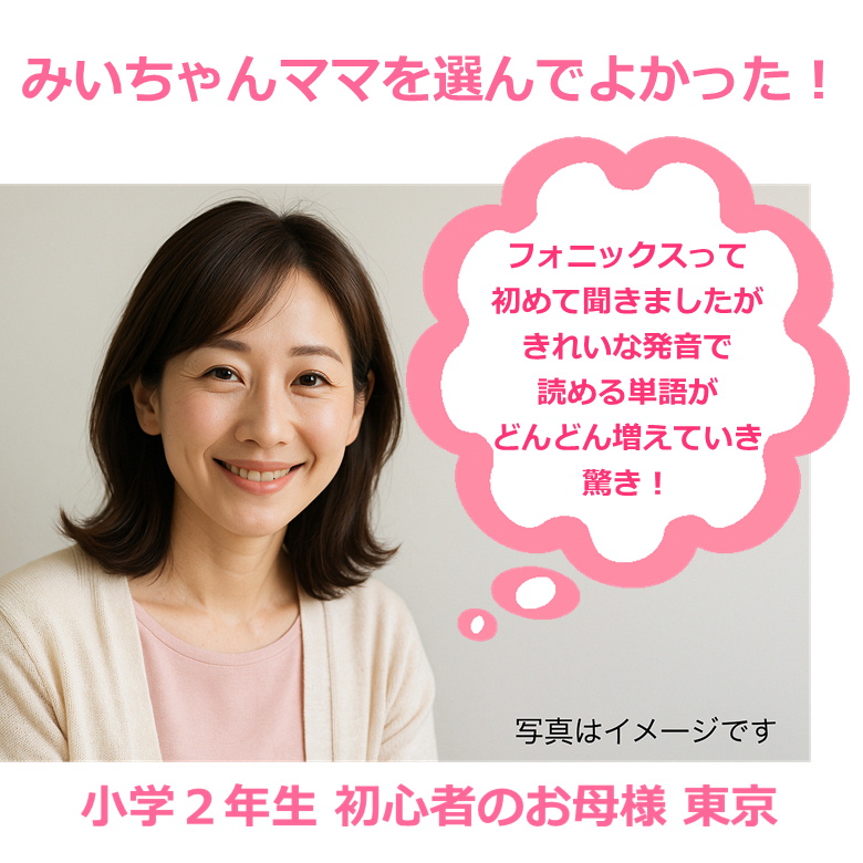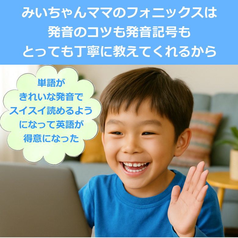 みいちゃんママのレッスンでは、 英語発音のコツをゼロから小学生にもわかるような日本語で丁寧に教えながらフォニックスも教えるので、単語がきれいな発音でスラスラ読めるようになります。